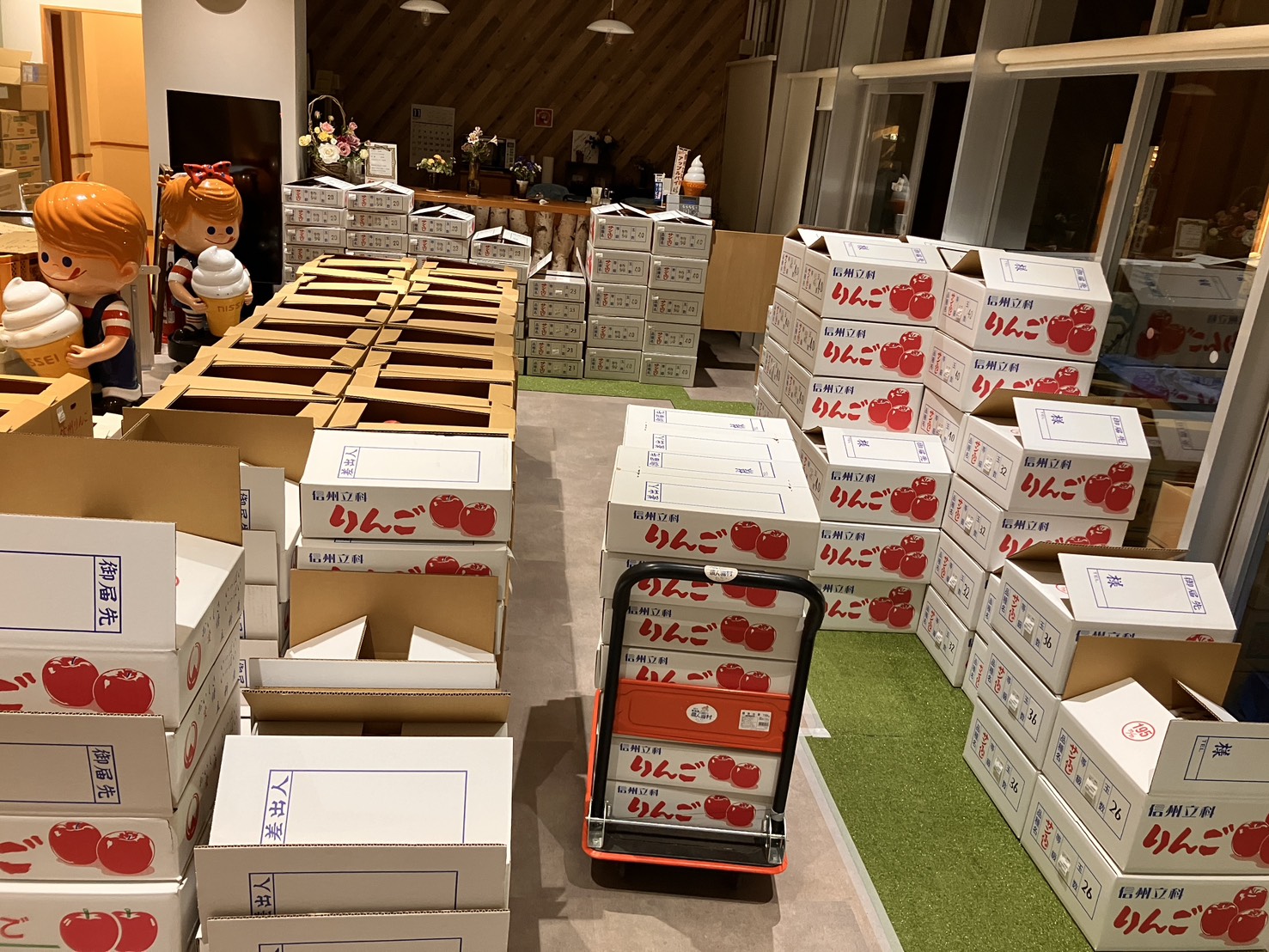 抽選会などはございませんが、立科のサンふじりんごが更に並ぶこの日は、贈り物には贈答用を!自分で食べるのは自家用を等選び方は人それぞれ、箱に並べられた赤いリンゴは1つ1つ個性があります。